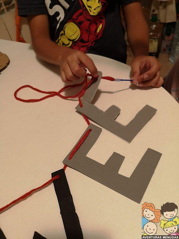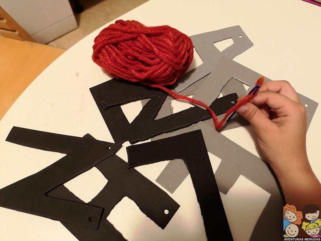 Usamos una aguja de plástico y lana del color elegido y pasamos la misma por cada agujero que hemos hecho en letras.