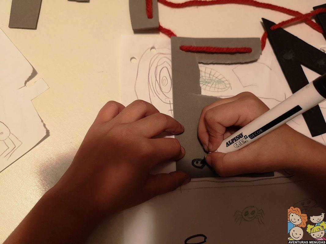 Decoramos con rotuladores multisuperficie, para poder usar el blanco sobre la goma eva negra. Hacemos dibujos de lo que más nos guste de halloween. En casa triunfaron las arañas y telarañas.