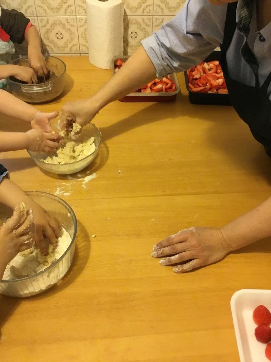 Hicimos fresas con crujiente. Como los “alumnos” son muy pequeños, preparé antes los ingredientes. Sólo tuvieron que amasar el crujiente y ponerlo por encima de las fresas.