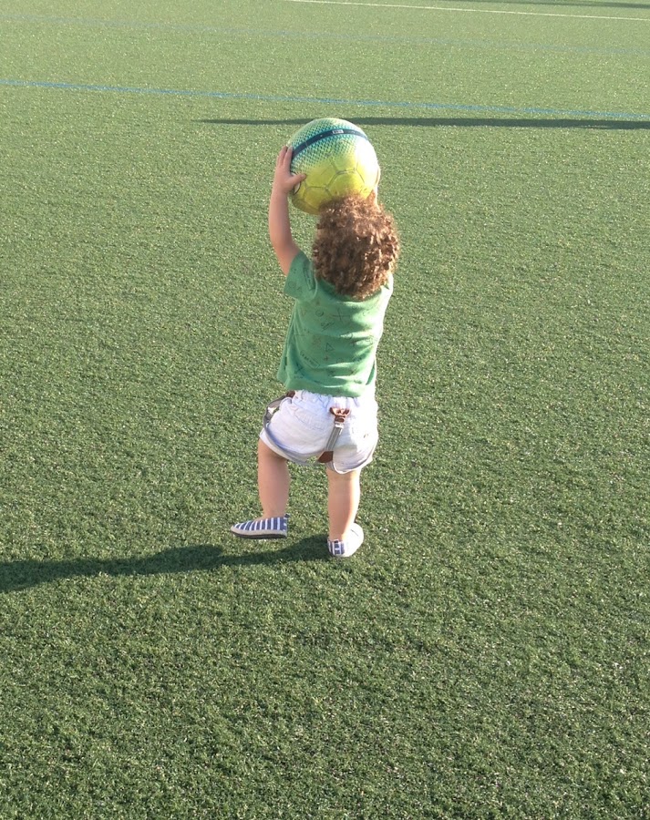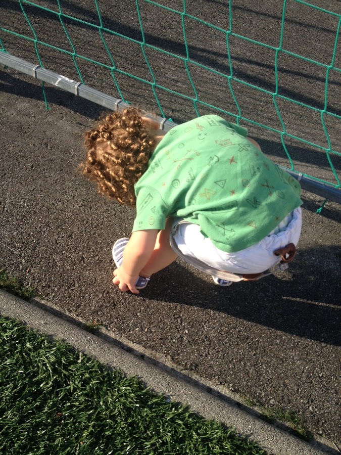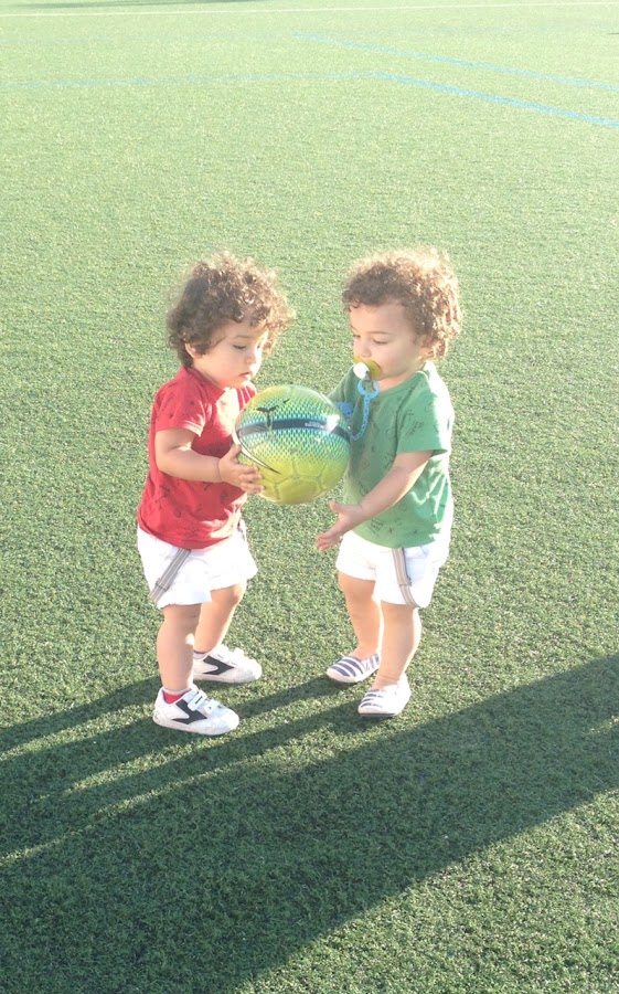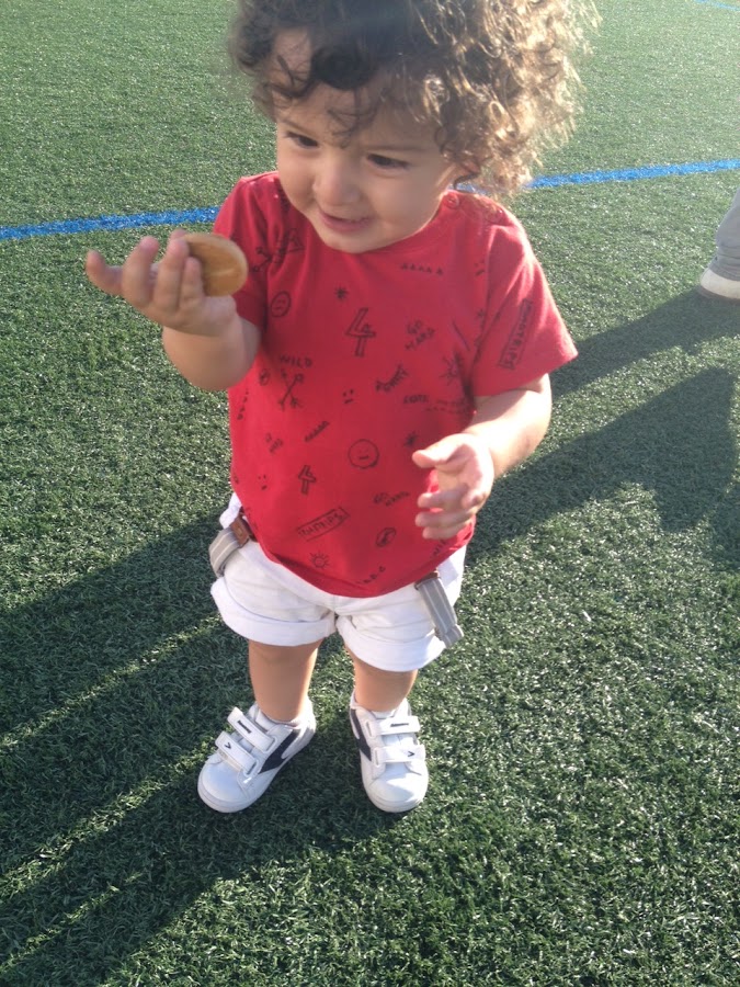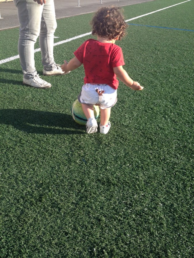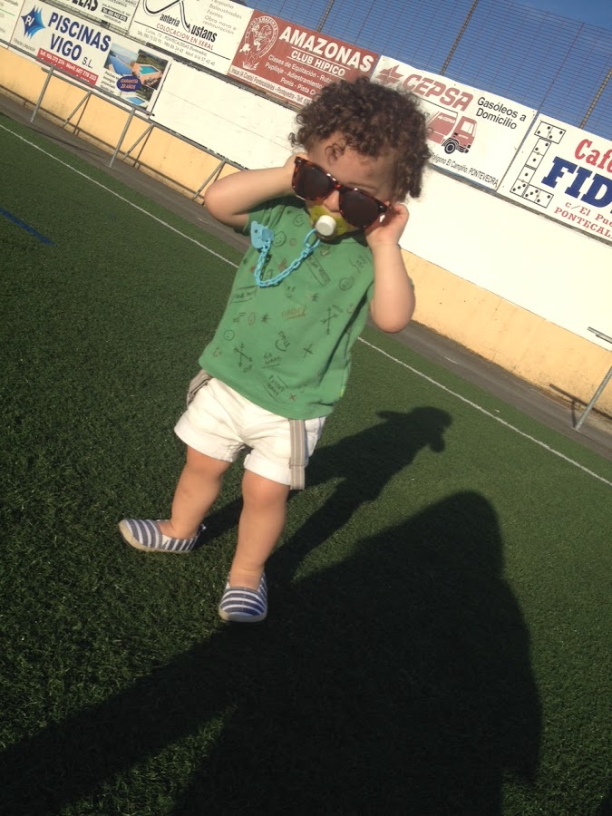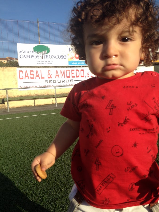 Brillaba el sol y hacía muchísimo calor, despues del paseo fuimos hasta el campo de fútbol de nuestro pueblo (Chan da Barcia) y allí, como tenemos mucho espacio... ¡¡a correr!! Comimos galletas, jugamos con la pelota y hasta Sergio se lanzó a probarse las gafas de sol de mamá.