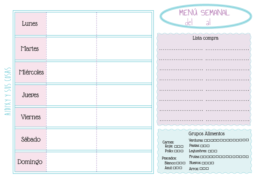 Y como soy muy buena, os he querido traer un freebie bonito bonito, para que os lo imprimáis si queréis, y os montéis ahí vuestros propios menús semanales. Os lo he querido hacer muy muy completo, por eso tenéis una lista de la compra, la zona para ir apuntando el menú, y lo mejor! una zona reservada para anotar los grupos de alimentos, y llevar un control de cuantas veces se ha comido qué alimento. Que yo hasta que no empecé a hacerlo, no me di cuenta, de las pocas veces que comíamos pescado!