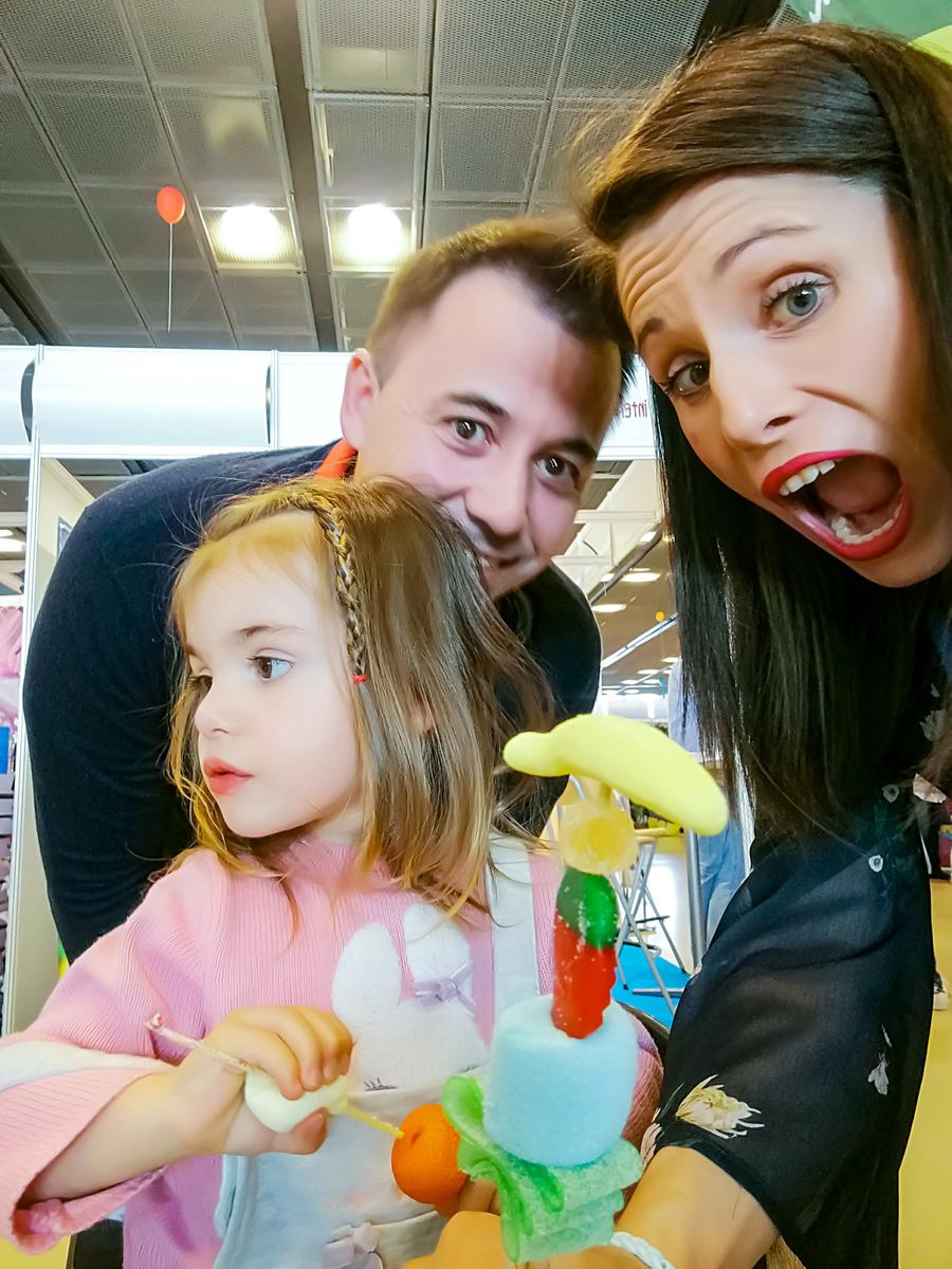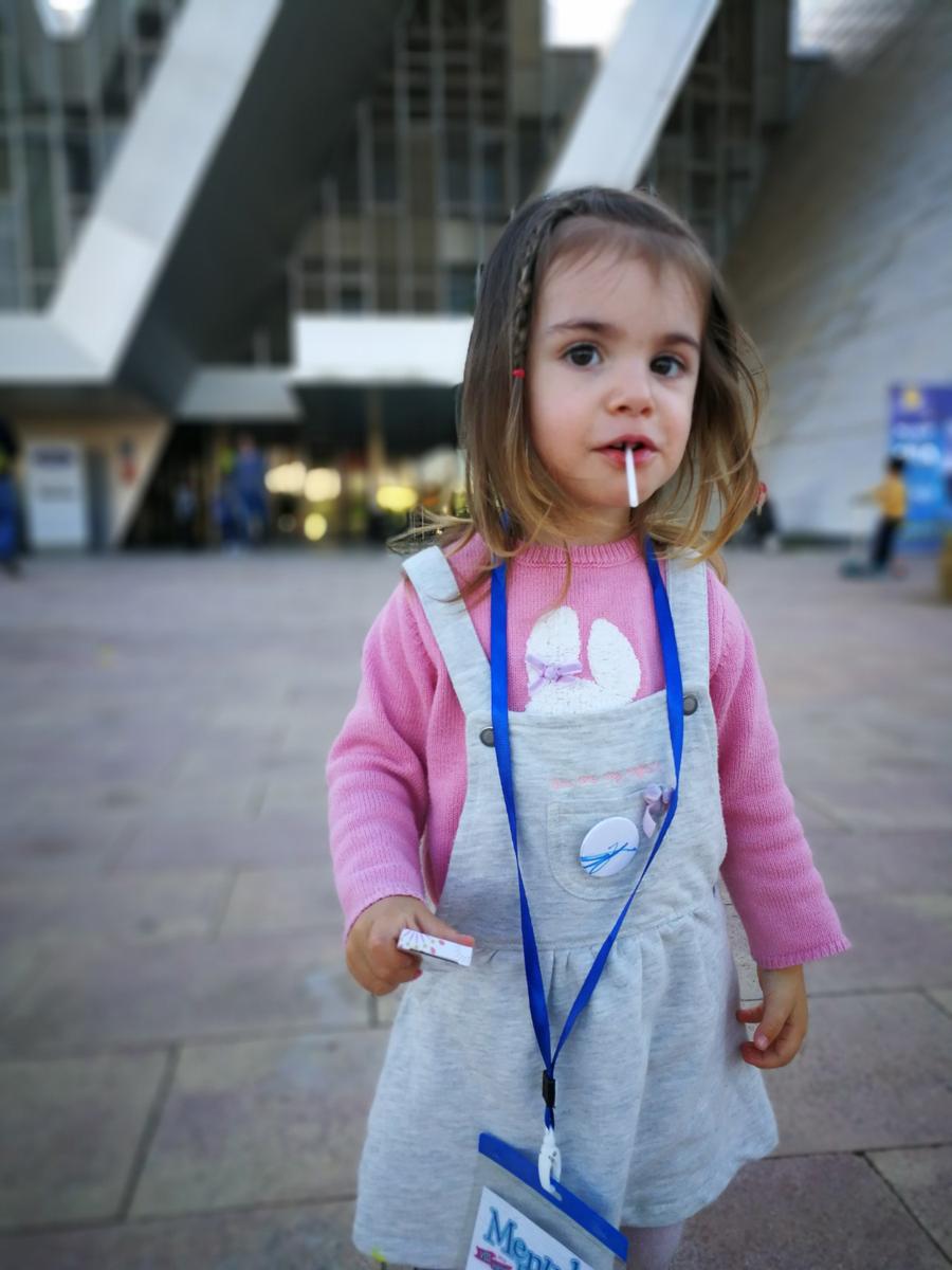 Zaira luce muy orgullosa su obra de arte, una chapa que hicimos en el Stand de AragónTV, se puso morada de comer chuches en el espacio de Martín Martín, bailó y se vino arriba con los recursos para la estimulación temprana de la música en los bebes de acamúsica.