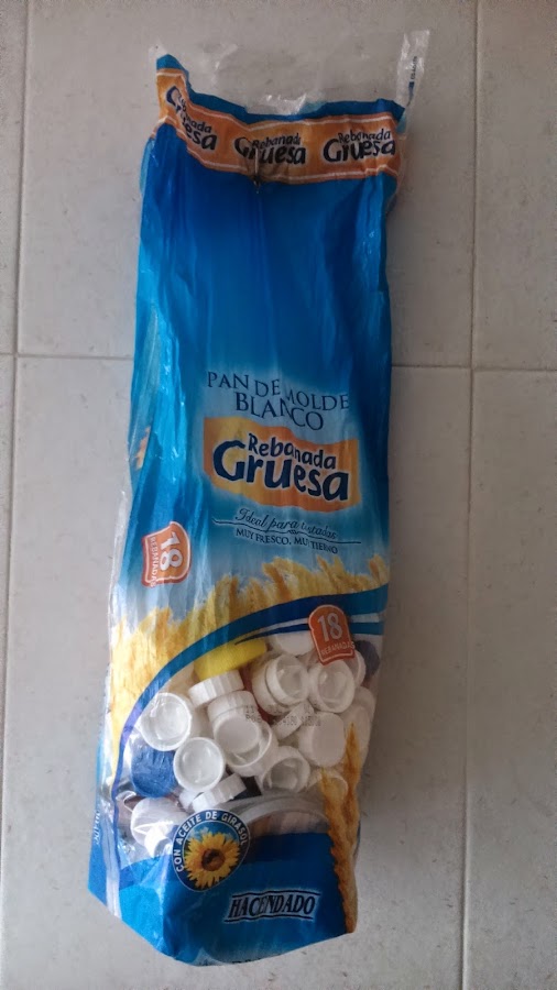 Esta mañana, cuando he enviado a mi hija al colegio, la he metido en su mochila una bolsa llena de tapones de plástico, estaba tan llena que por su propio peso había despegado el gancho que tengo pegado a la pared para dejarla colgada, cosa que me facilita el tenerlo a mano cada vez que hecho un tapón para reciclar.