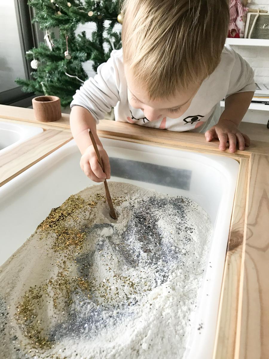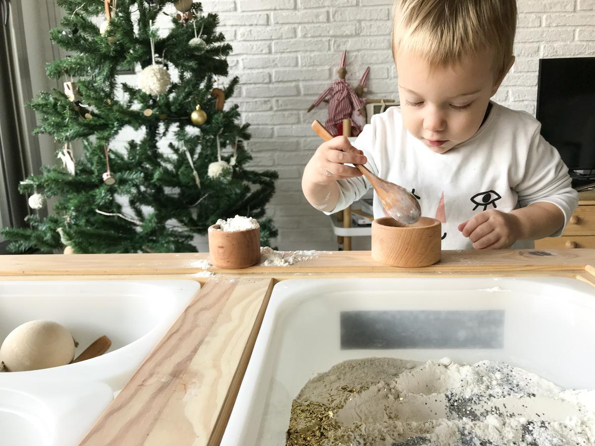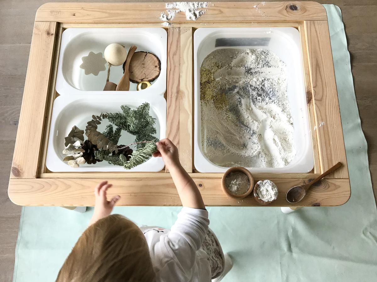 Y después, del mini tostón teórico os dejo con las imágenes de la mesa de experimentación de invierno. Para esta ocasión escogí como elemento principal la harina, y añadí un poco (bastante) de purpurina (idea que cogí de nuestro grupo de crianza) para darle ese toque navideño. Como materiales le dejé: ramitas de abeto y eucalipto, piñas, trozos de madera y recipientes y utensilios.