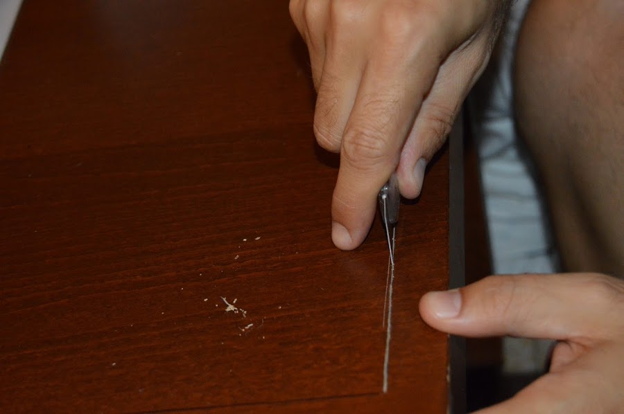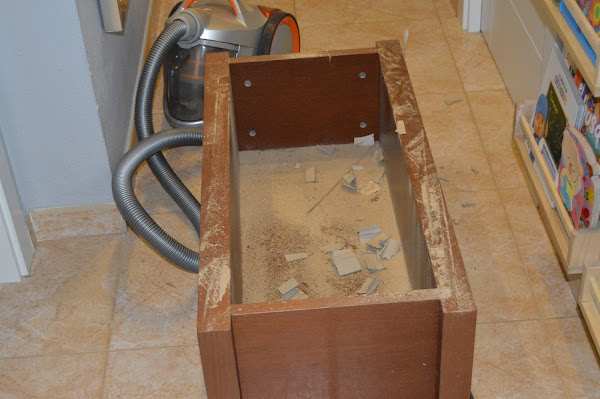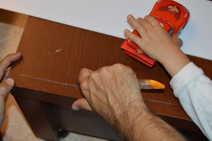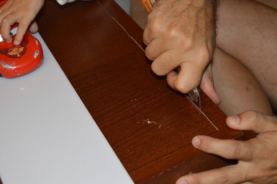 Y comenzaron a ponerse manos a la obra (mis hijos y mi marido como jefe de operaciones). Primero retiraron la tapa del mueble para trabajar mejor. Marcaron con rotulador las medidas de nuestra mesa de luz y comenzaron a cortar (Gracias a Balbino que tenía caladora, claro).