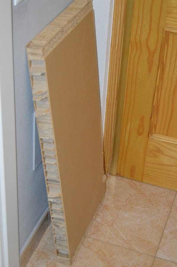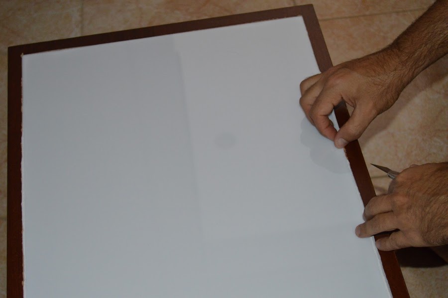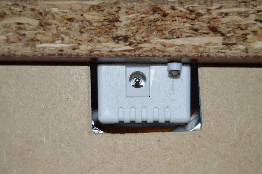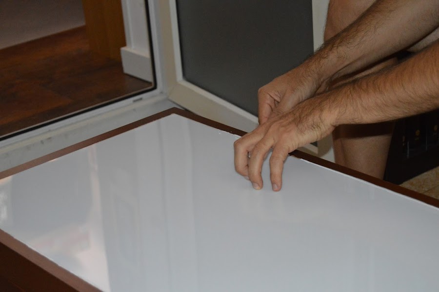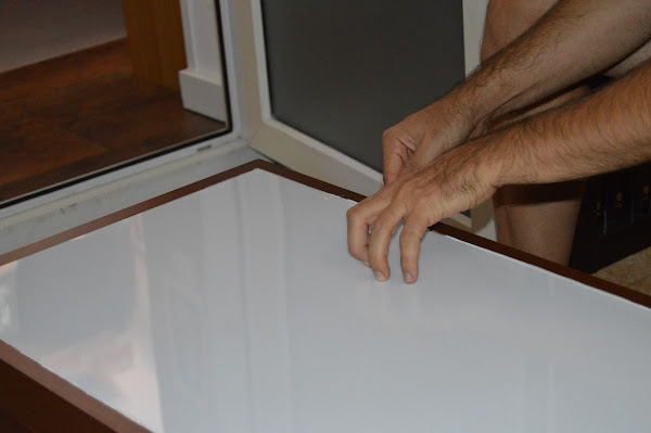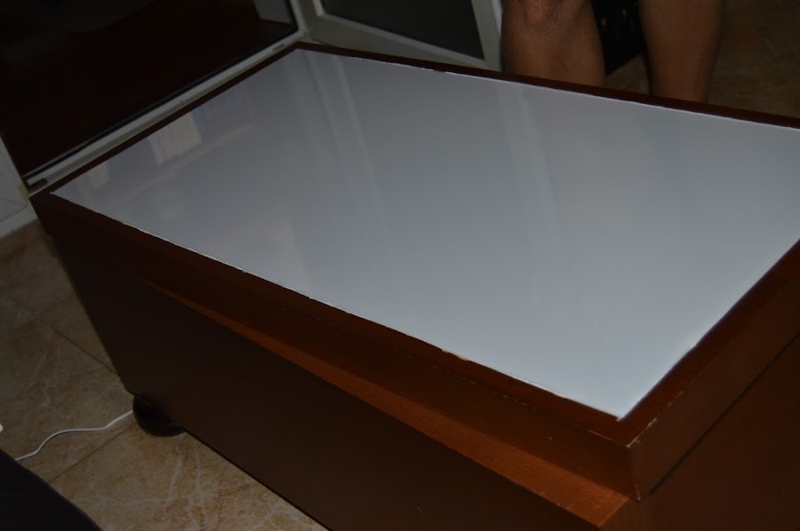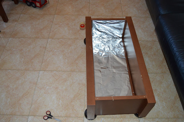 Después de lijar los desperfectos, colocaron el panel de vidrio plástico y comenzaron a poner la tira de luces led en el mueble. Para que la luz estuviera bien distribuida, colocaron (sí, lo digo en plural porque mis dos ratones estaban con su padre “ayudando” =D) papel de aluminio.