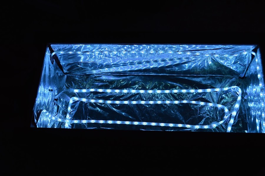 La primera vez que fuimos a buscar materiales a Leroy Merlin encontramos un panel de luz led que nos pareció adecuado para ejercer de mesa de luz portátil. Allí la luz nos parecía genial y yo ya me la imaginaba con cosas encima y los niños jugando. Luego llegamos a casa y la luz era cegadora. Diez segundos mirando ese panel y ya me dolía la cabeza. La seguridad de los niños está por encima de todo y si se trata de sus ojos, no hay nada más que hablar. Así que devolvimos el panel y compramos una tira de luces de led de 5 metros con mando a distancia y posibilidades varias de cambiar el color a la mesa.