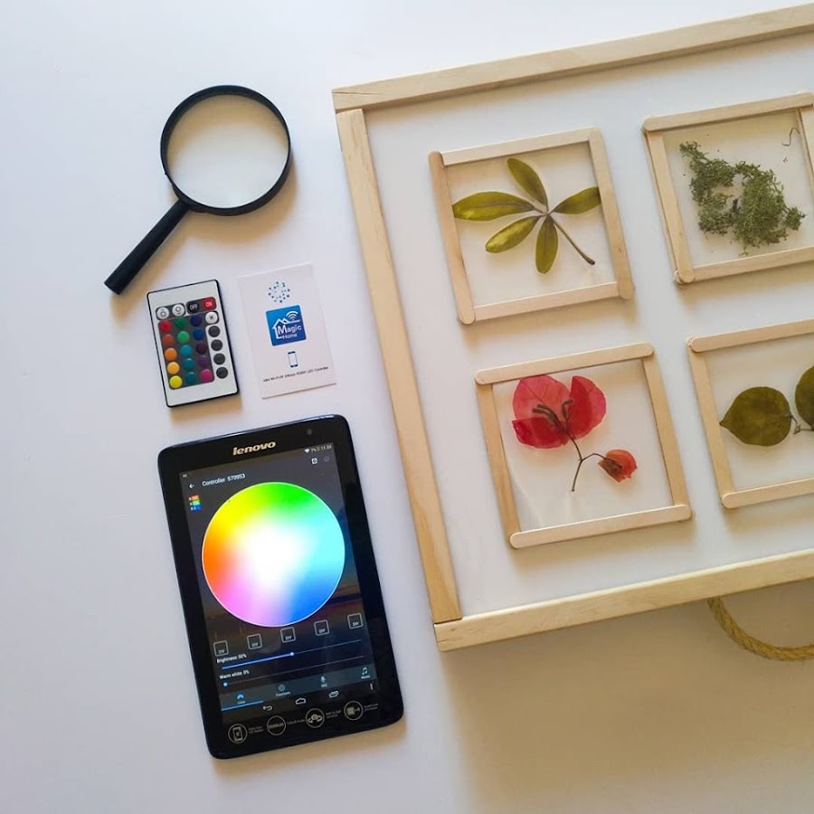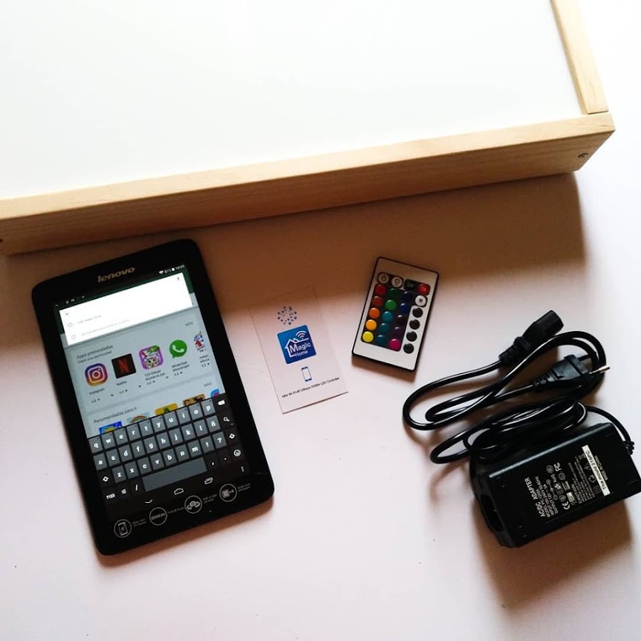 Led RGBW 5050 IP65 (Color blanco más puro) Funciona con un mando a distancia y además tiene conexión al teléfono móvil/tablet, lo que da muchas más funcionalidades a la mesa de luz. Esta es la que nosotros tenemos. Nos da la posibilidad de ajustar el color, utilizar la función de micrófono, hacer que los colores bailen al ritmo de la música y usar múltiples efectos.