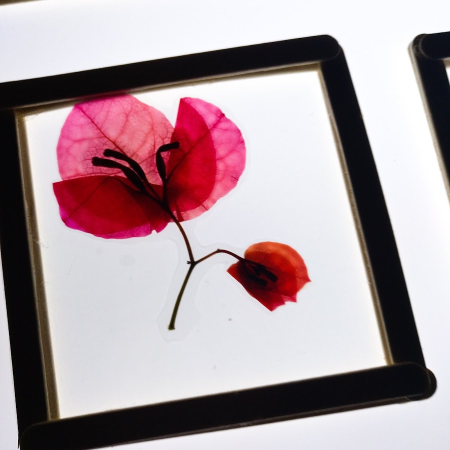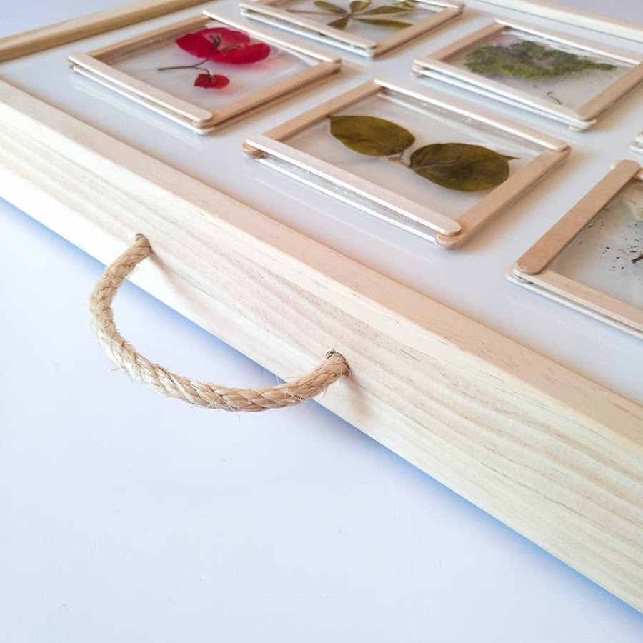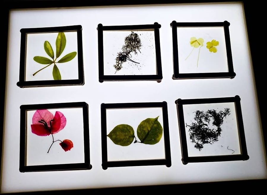 Se trata de 6 PANELES CON ELEMENTOS NATURALES en su interior. Cada uno es diferente y al dejar pasar la luz se convierten en un recuro mágico. Además, si los miramos con la lupa el resultado es espectacular.
