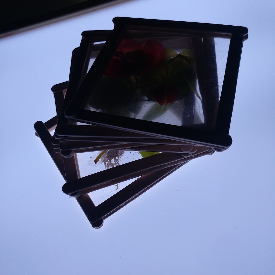PASO 2. Les hacemos un marco doble con los depresores, pegándolos con silicona líquida y los dejamos secar.