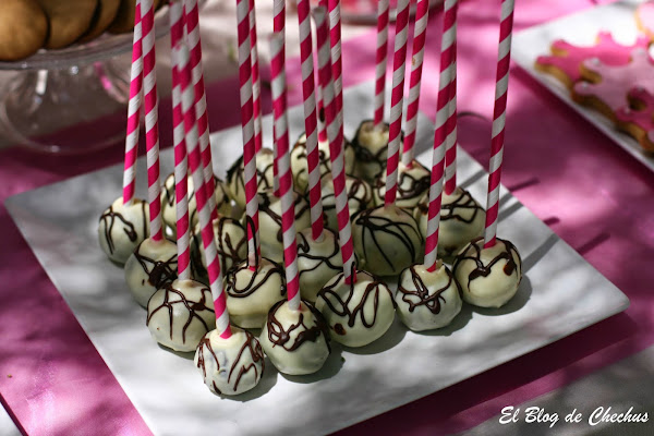 Además había galletas decoradas con fondant, con su nombre en un jarrón y con formas de zapato y corona delante en un plato. Otra bandeja con cakepops de cubiertos de chocolate blanco, presidian la mesa