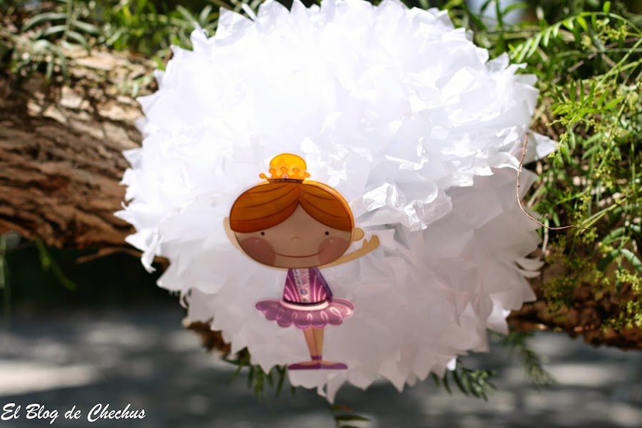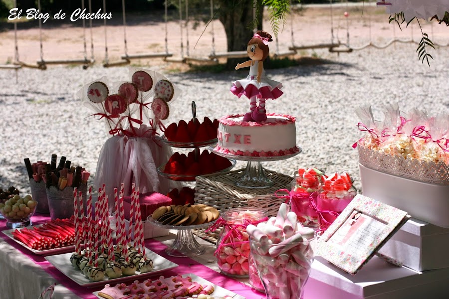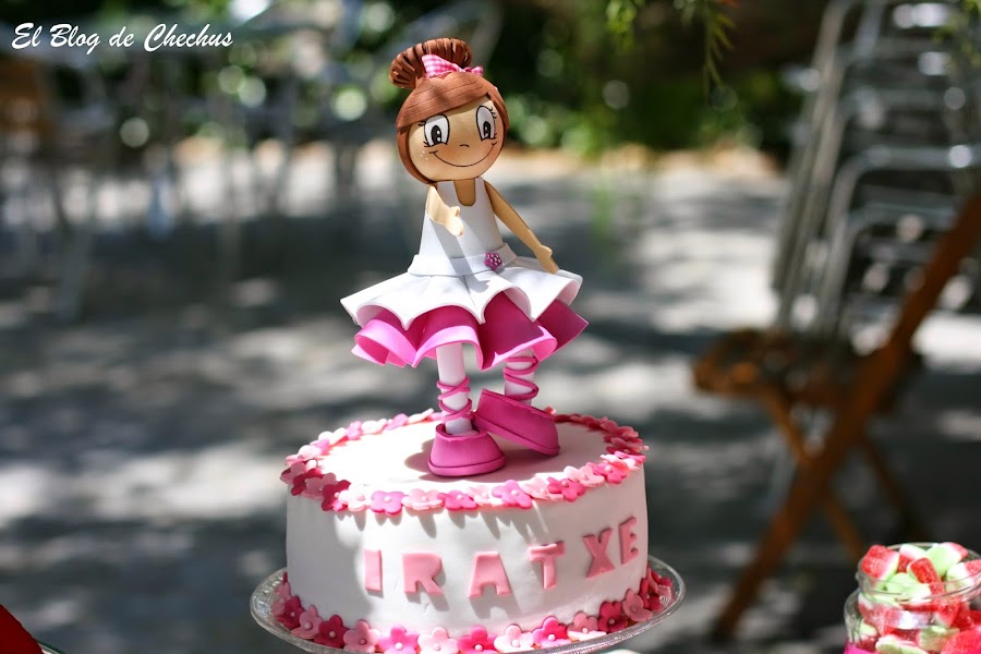 Puse bailarinas por los pompones, un tutú en un jarrón con galletas, y principalmente, la tarta con una muñeca de goma-eva como si bailara.