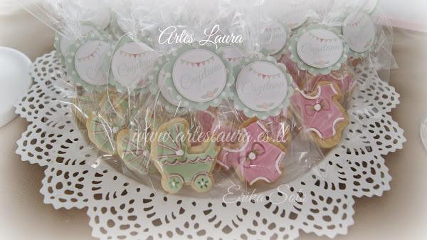 Para este bautizo le preparamos las galletas que se dieron de recordatorios, los sobres en los que se daba la foto para el recordatorio, todo tipo de repostería, carteleria y adornos.