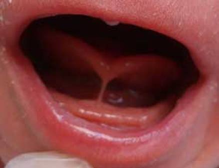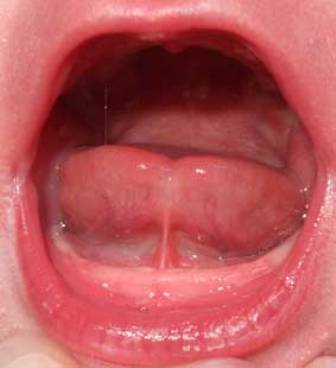 La inserción del frenillo se produce en la punta de la lengua. Cuando el bebé llora, la lengua tiene forma de corazón o parece bífida, ya que el frenillo tira de la punta de la lengua hacia el interior de la boca.