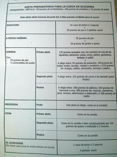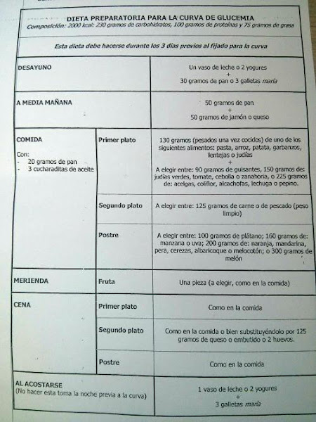 Después del positivo me llamaron para hacer lo que se suponía que tenía que ser una sesión en la que nos enseñarían la nutrición que debíamos llevar durante el resto de nuestro embarazo y explicarnos como hacernos los controles necesarios en la diabetes gestacional. La realidad: nos enseñaron que debíamos pincharnos para hacer control de glicemia 5 veces al día y dos controles de cetona. De la parte de explicarnos cómo debíamos alimentarnos se la saltaron un poco; nos hablaros de lo que son los hidratos y los alimentos prohibidos. También nos dijeron cuales eran los posibles problemas de la diabetes gestacional. Hasta aquí, quizá consideraba una perdida de tiempo en mi caso concreto ya que soy profesora de biología de bachillerato ye esto forma parte del temario pero no creo que estuviese mal pero la guinda del pastel llegó al darnos las dietas que debíamos seguir. El tema es que si vas a cualquier médico, te hará una serie de preguntas antes de enviarte una dieta personalizada pero en nuestro caso, solo se hizo una pregunta: ¿Semana de embarazo? En mi caso estaba de unas 28 semanas por aquel entonces así que me tocó la dieta del 3r trimestre y... SORPRESA! resultó que la dieta era prácticamente la misma que la que seguía para la curva de glucosa. De hecho, era aún más completa si cabe (en cuanto a cantidades). Las enfermeras a cargo nos dieron también un libro de la generalitat de Catalunya sobre la diabetes gestacionales y nos comentaron que en el hospital ellos usaban unos valores distintos a los que figuraban en el libro (más estrictos). También nos comentaros que podíamos intentar adaptar la dieta a nuestra dieta habitual siempre que los valores fuesen correctos.