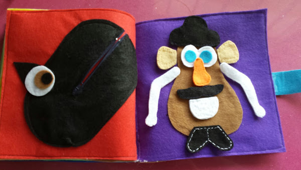 · Otro que me parecía imprescindible: un Sr. Patata pero… tenía que pensar en dónde guardar todas sus partes … y entonces lo encontré! Quería que en el libro estuviera presente la cremallera, un básico también muy necesario para la vida cotidiana, así que lo incluí como elemento en la página anterior… la boca de un temible o adorable dragón! Que no escupía fuego, sino... al Sr. Patata poquito a poco (ojos, narizota, boca sonriente, bigote, orejas, brazos, sombrero y zapatos, todo tiene cabida en este imaginativo bolsillo).