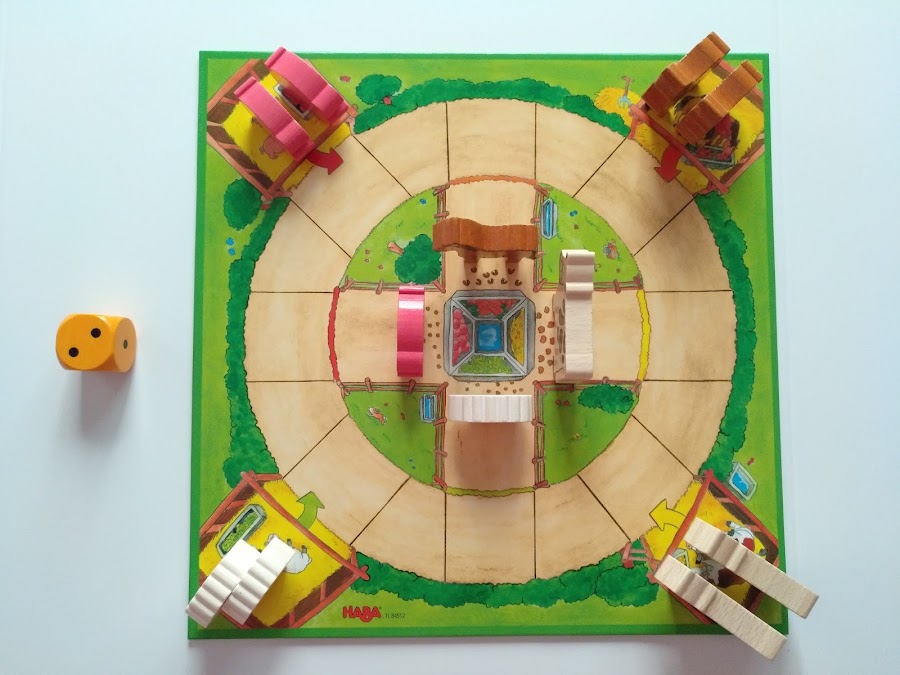 El primer jugador lanza el dado. Si le sale un 3, puede sacar a uno de sus animales del establo y colocarlo en la casilla de delante. Si ya tiene a todos sus animales fuera del establo y le sale un 3, entonces avanzará 3 casillas con el animal que escoja.