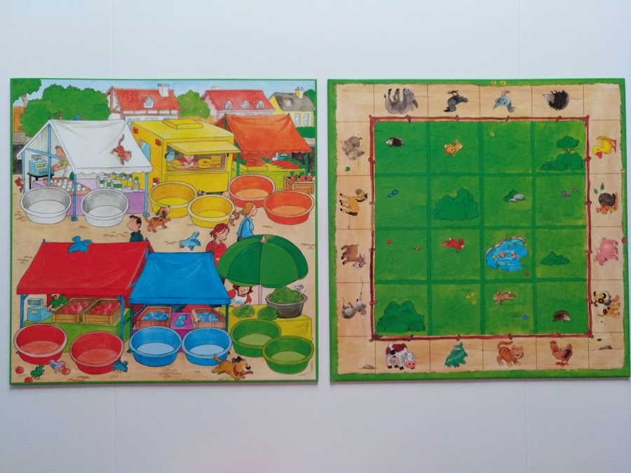 Los tableros reversibles (estampados a doble cara) nos proporcionan cuatro escenarios distintos: la granja, el mercado, la pradera y el parchís de la granja.