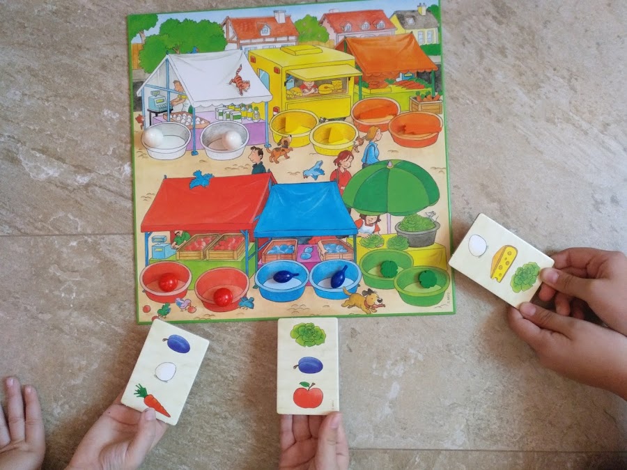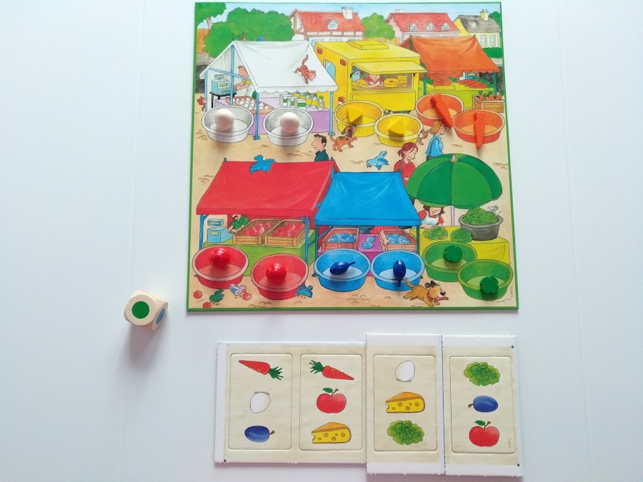 Comienza el jugador que antes sepa decir 3 cosas que se puedan encontrar en un mercado o el más joven. Este jugador lanza el dado y obtiene un color. Debe coger un alimento de ese color para ir completando las distintas listas.