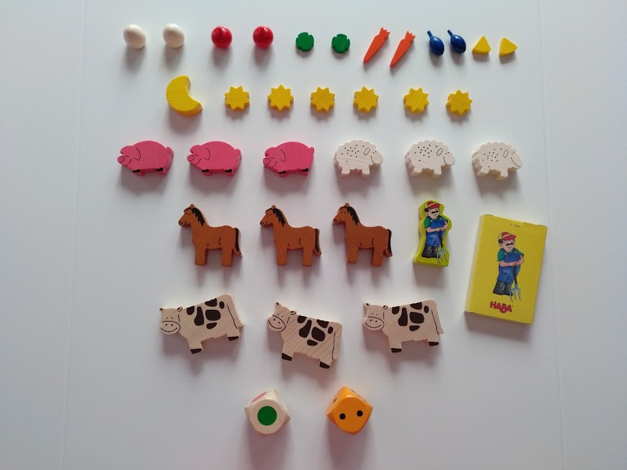 Además esta caja de tesoros contiene otros elementosde juego como: cartas, cartones gruesos y una gran cantidad de figuritas de madera de calidad y resistencia inmejorables para simular frutas, verduras y animales. Hasta un granjero con bigote. Con todos ellos, podemos divertirnos jugando a juegos cooperativos, clásicos como el parchís, de memoria, de carreras, colores y primeros juegos tácticos.