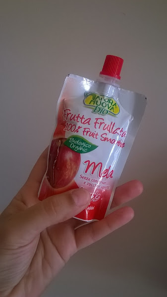 Una bolsa de papilla de frutas (manzana) biológica de la marca Natura Nuova Bio.
