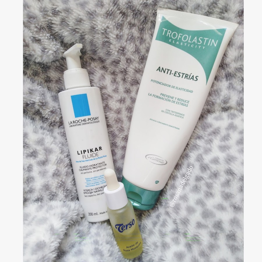 Por suerte, tampoco tuve estrías ni gané demasiado peso, pero algún kilito extra ya se había colado del embarazo anterior y ahí sigue (y no me quejo, que aún comiendo sano soy débil cuando de chocolate se trata...). Me cuidé lo justo y necesario, sin excesos en la alimentación y siendo constante con el cuidado de la piel. Usé a diario protector solar para el rostro (a pesar de que he salido muy poco de casa en estos últimos meses), Trofolastin para evitar las estrías en la zona de la barriga, aceite de rosa mosqueta en algunas ocasiones y Lipikar fluido de La Roche Posay, una loción hidratante corporal para pieles sensibles.