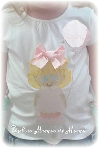 El problema era que las siguientes semanas estaban plagadas de BBC (bodas, bautizos, comuniones), no veía el día de estrenarla! Pero por fin llegó: un cumpleaños era la ocasión perfecta de estrenarla y lucirla. Le puse unos pantalones vaqueros cortos, zapatillas de loneta rosas, en el pelo el lazo rosa de la bolsa en la que venía la camiseta y su camiseta personalizada.