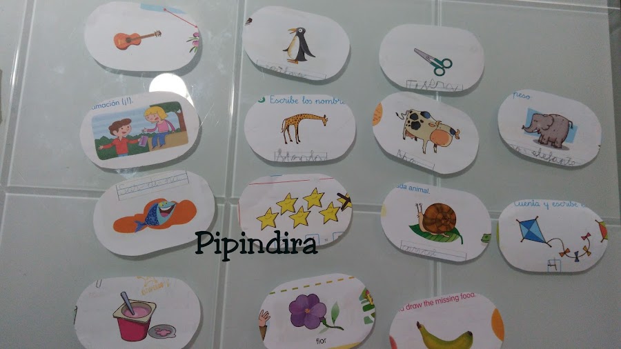 Después de aprendernos los nombres de los dibujos los hemos escrito en la tapadera y volvemos a hacer el juego.