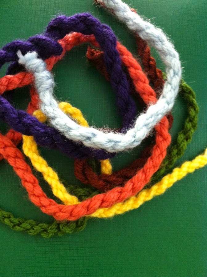Primer paso: cortar hebras de unos 3 metros de lana o hilo de algodón (del grueso). Cuantas más hebras pongamos juntas, más grueso nos quedará el cordón.