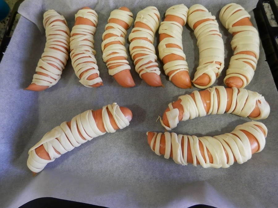 Envolvemos las salchichas con las tiras de hojaldre que hemos cortado.