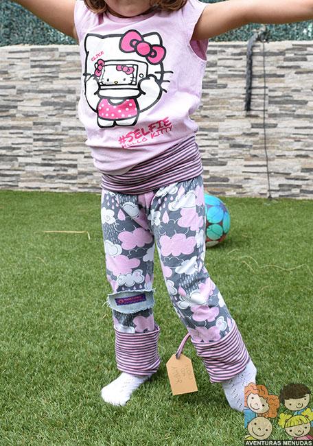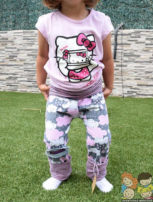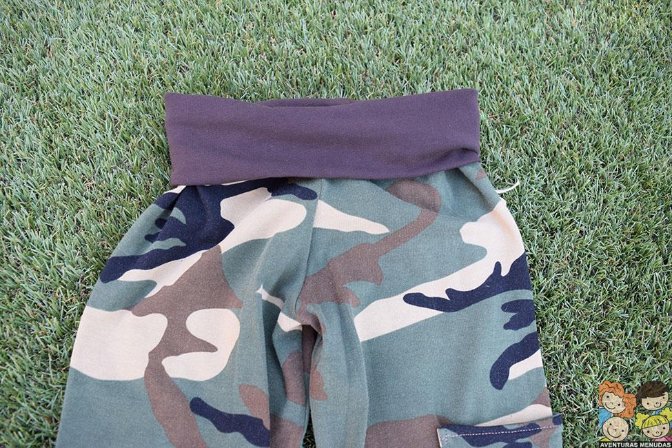 Si lo veis tal cual, es para un niño de 5-6 años, pero cuando empiezas a manipular la cintura y los puños, es decir, las partes que están en otra tela, puedes conseguir un pantalón para un niño mucho más pequeño. Mirar la diferencia entre tal cual y con la cintura y puños recogidos. En esto consisten estos pantalones evolutivos, puedes ir ajustando cintura y camales del pantalón, según el niño o niña vayan creciendo.