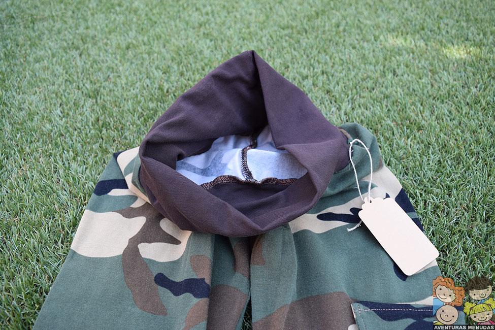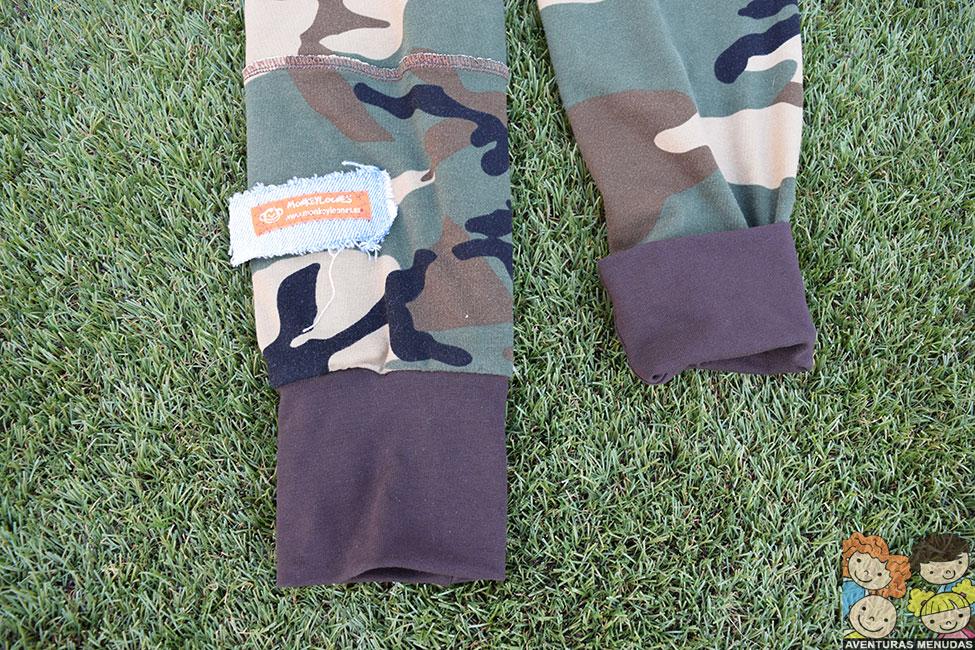 Para el peque, estilo militar con puños y cintura marrones. Este modelo no es evolutivo, aunque tanto la cintura como los puños de los tobillos te dan mucho juego para alargar un poco más el uso de la prenda.