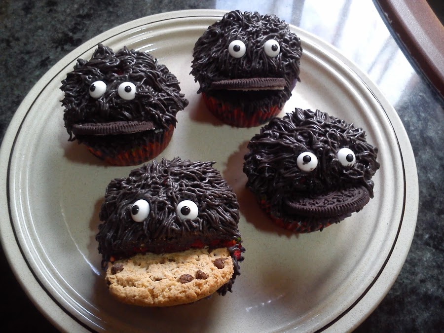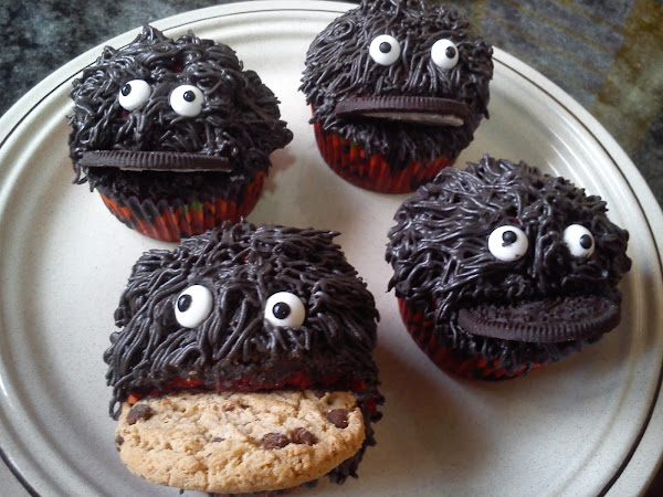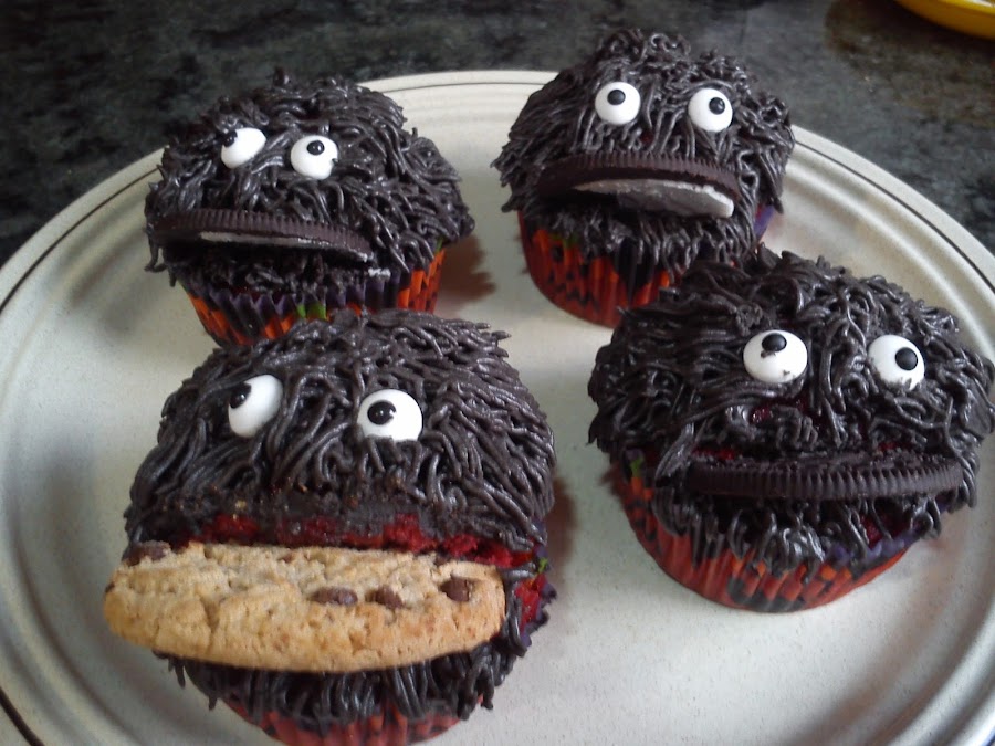 Ahora sólo queda decorarlas, se hace un corte en un lado y se mete una galleta y empezamos con la manga pastelera a hacer los hillillos de debajo de la boca, luego ya vamos haciendo los de encima y por toda la magdalena, colocamos los ojos de azúcar y monstruos terminados.
