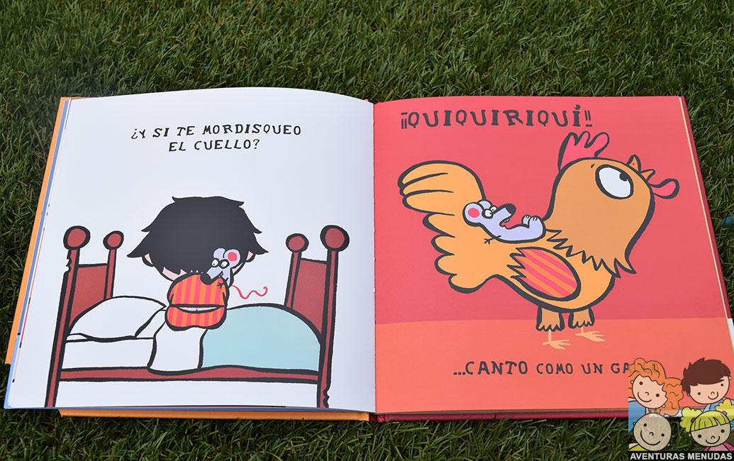 Si aún queréis meteros más en el cuento, podéis todos juntos imitar cada una de las acciones que el niño dice que va a hacer ante los mordisquitos de su compañero el ratón. Imaginaos a todos cantando QUIQUIRIQUIIIII como el gallo, después de haberles hecho cosquillas en el cuello. Realmente divertido, ¿a que si?