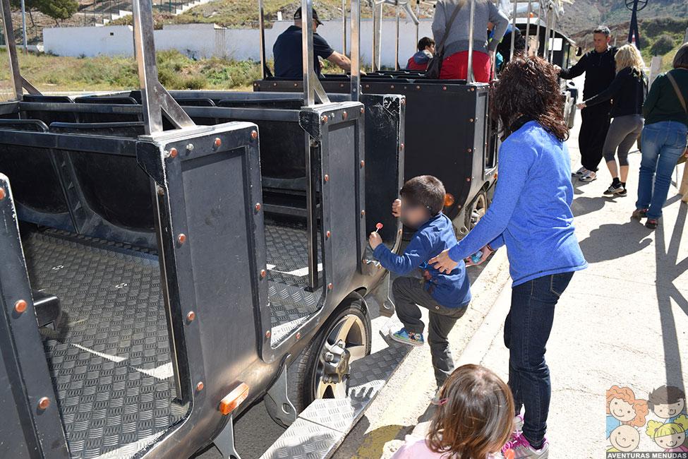 Lo siguiente es subir al tren que te lleva a la mina. Esta parte les encanta a los peques, ya que es divertido tanto el tipo de tren, vagones sin ventanas y un camino con curvas y cuesta arriba. ¡Vamos toda una diversión!