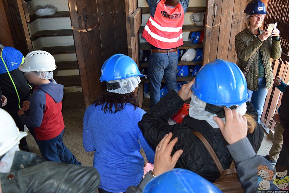 Después de la explicación, nos dirigimos a la puerta de entrada a la mina, donde nos dan un casco a cada uno (incluso a los más pequeños), junto con un protector desechable para ponerlo en la cabeza por higiene. En este punto, los peques iban emocionados con su casco, jajajaja.