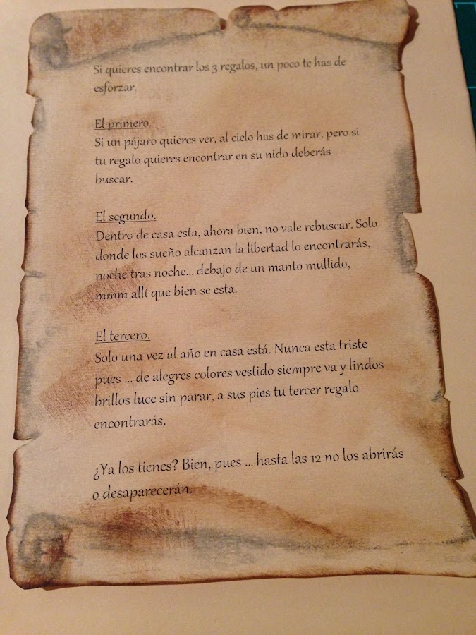 Aprovechando que Carlota era todavía muy pequeña y que no se enteraba de nada, idee una búsqueda del tesoro, dicha búsqueda consistía en descifrar un pergamino que previamente me trabaje y elaboré con acertijos muy fáciles, tenía que buscar sus regalos de Navidad la mañana del 24 de Diciembre.