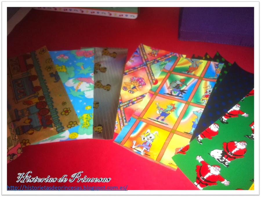 Ahora toca el contenido, yo he optado por papel de regalo de unas muestras que tenía por casa (por fin les daba un uso), fabrique pequeñas bolsitas con este papel.