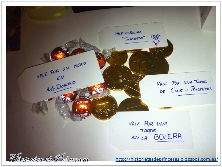 Yo puse 20 chocolates y 4 detalles exclusive, que consisten en 4 vales donde dedicaremos la tarde a una actividad, como ir al cine, a la bolera o al mc donald, la ultima es sorpresa jajajajaa vale lo reconozco no se me ocurría nada que poner y me dije ... pongo esto y lo voy pensando con calma.