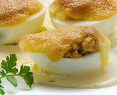 Cocemos 8 huevos durante 10 minutos. Para poder trabajar con ellos después de cocerlos, lo escurrimos, y después los refrescamos un poco con agua fría, los pelamos y los partimos en mitades (importante a los largo y no a lo ancho). Retiramos las yemas y las reservamos. Cambiemos….