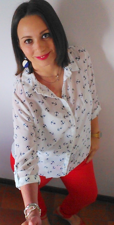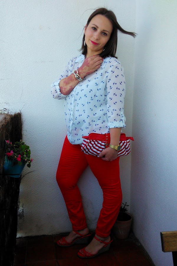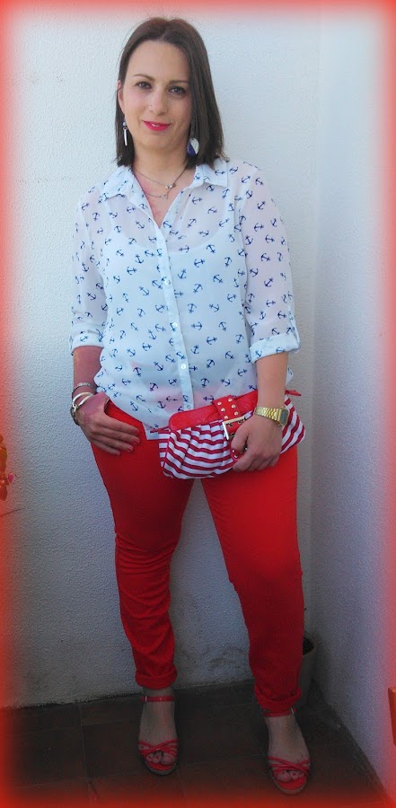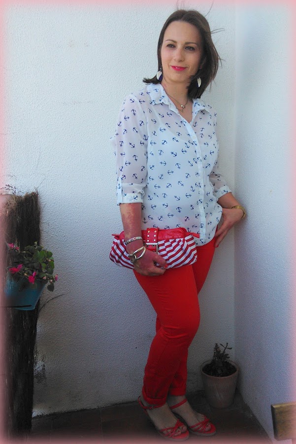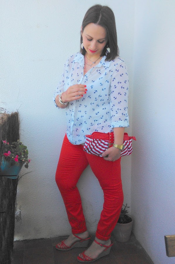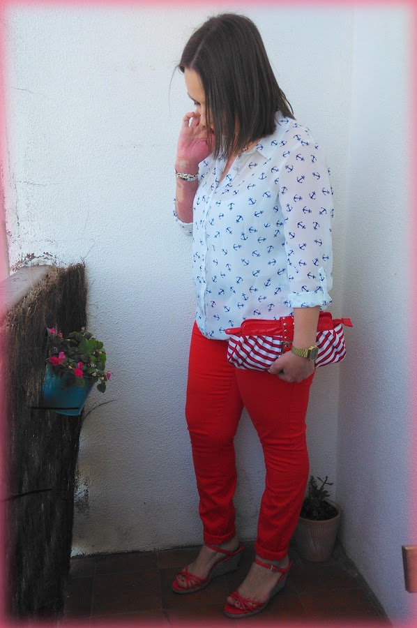 Estoy enamorada de mi camisa de anclas de Primark!!! Nada más verla dije: esta para mi!!! y tenía ganas de un pantalón rojo así que perfecto!! Por lo demás ya veis, Cartera en rayas marineras en rojo, que tiene sus años pero que no uso demasiado aunque me encanta!! y cuñas en rojo de Zara, también de otra temporada.