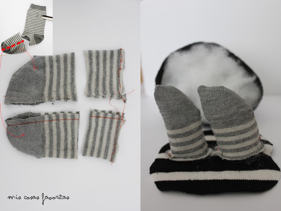 Ahora usamos la parte delantera del calcetín, la cortamos en dos longitudinalmente y pasamos un pespunte: con esto haremos las orejas. Una vez unido, cortamos el trozo de abajo de unos 3 cm. y lo reservamos para hacer los calcetines.