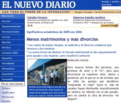 Según esta nota, en el año 2006 se celebraron en Managua la mitad de matrimonios que en el 2005, pero los divorcios se dispararon en un 8% más. Y eso que no son baratos; el costo de recuperar la libertad variará de acuerdo a la cantidad de bienes y derechos por los que haya que pelear.