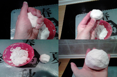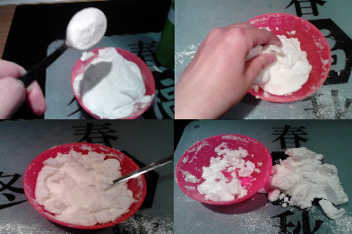 - Llené un bol pequeño con la espuma y a continuación añadí 5 cucharadas colmadas de bicarbonato y fui mezclando con los dedos ( no os asustéis es un poco engorroso!!), lo dejé reposar un minuto más o menos y añadí otras cinco cucharadas y así sucesivamente hasta que se quedó como en las imágenes. Mi consejo: que probéis primero con menos cantidad y una vez logrado haced toda la que queráis.
