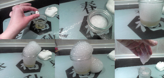 Llenamos el bote de cristal hasta la mitad con vinagre. A continuación cogemos una bolita de la masa y la echamos dentro.Enseguida empieza a burbujear y a levarse produciendo una espuma que sale y que al caer forma filas como si fuera un gusano.Cuanto más grande sea la bolita más denso es el gusano de espuma.