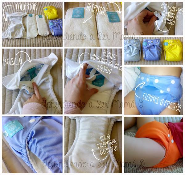 Nosotros elegimos unos pañales híbridos con bolsillo, "todo en dos", es decir, compuestos de cobertor e insertos (puedes poner insertos lavables o desechables, según prefieras). Los insertos lavables son como unas compresas (que también las hay de distintos tipos de tejidos, con distintos grados de absorbencia), que se introducen en un bolsillo del cobertor impermeable. La función del bolsillo es mantener los insertos separados de la piel del culito del bebé y que así no pase la humedad (los insertos desechables se colocan por fuera del bolsillo, por lo que el cobertor no se mancharía nada). Es complicado explicarlo por escrito, así que os dejo unas imágenes para que lo entendáis mejor: