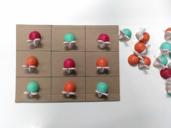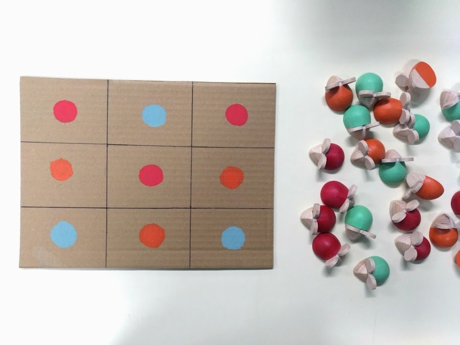 Otra posibilidad de juego con los ratoncitos es esta, una especie de lógico elaborado de cartón. Deben colocar un ratoncito del color correspondiente en cada casilla.