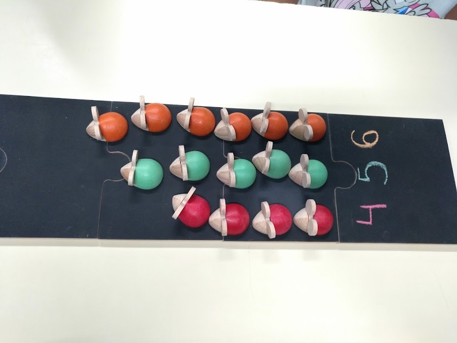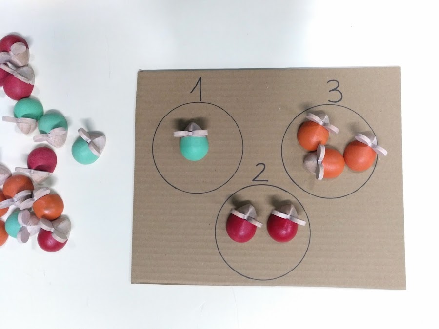 De igual forma, podemos trabajar la asociación número cantidad. Utilizando otro tablero de cartón de elaboración propia y los ratoncitos de colores de Chalking Sumouse.