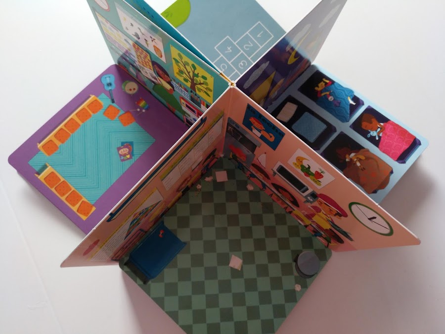 Los peques deben encontrar los objetos de las cuatro estancias que nos muestra el libro: aula, cocina, zona de siesta y patio. Cada estancia tiene dos variantes, según cómo se acomoden las páginas. Y en cada una de las páginas que quedan abajo (formando el suelo de las estancias) encontramos los diferentes elementos que los peques deben de buscar en las imágenes de las paredes.