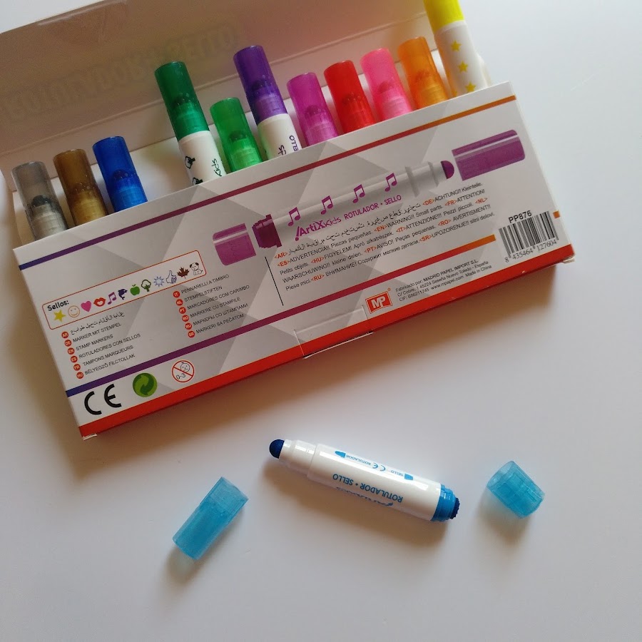 ROTULADORES CON SELLO 12u. Tienen unos colores muy vivos y son de larga duración. Además tienen la punta resiste, es redondeada facilitando su uso. Cada color tiene un sello diferente, todos muy divertidos: estrella, carita feliz, delfín, árbol, corazón... ¡A los peques les chiflan!